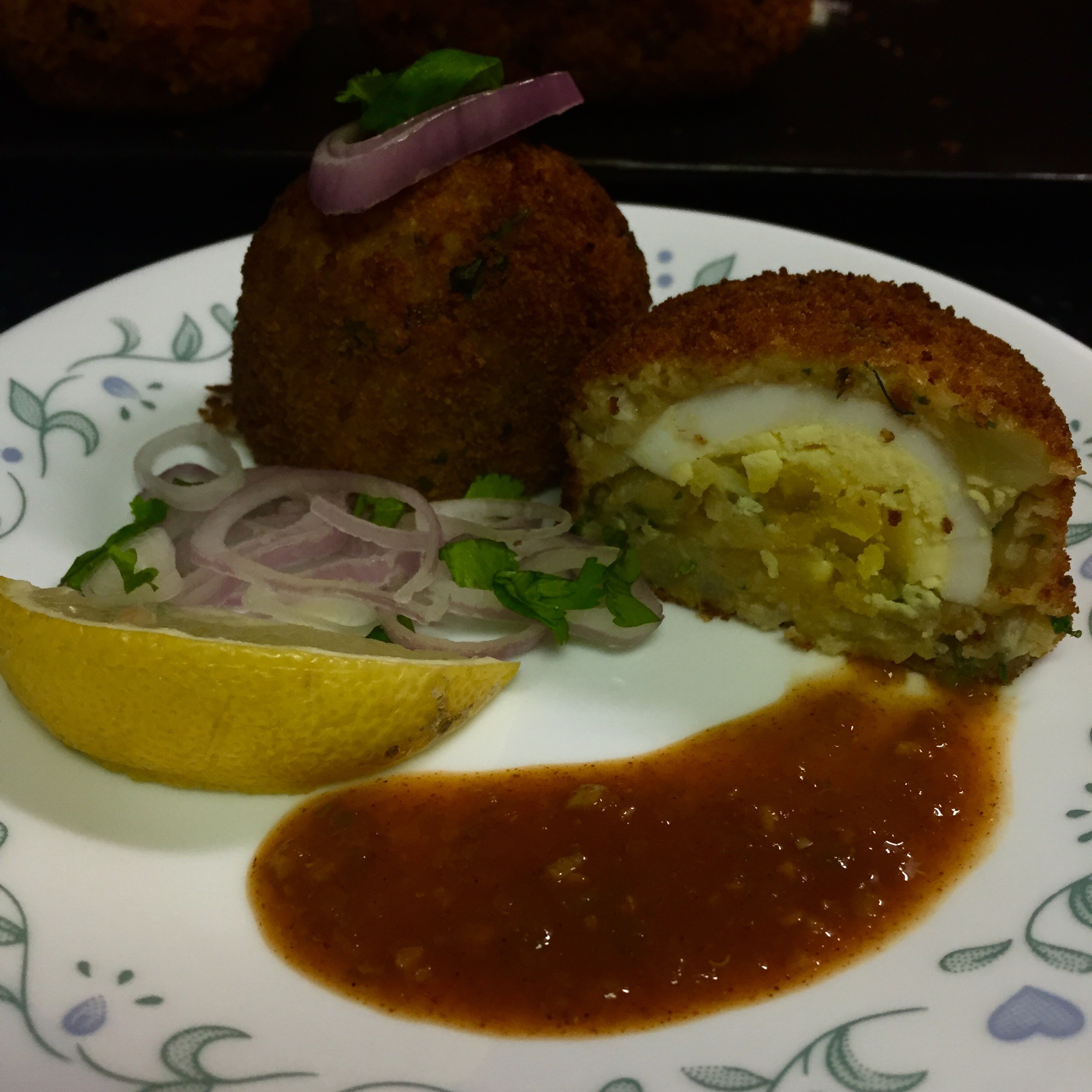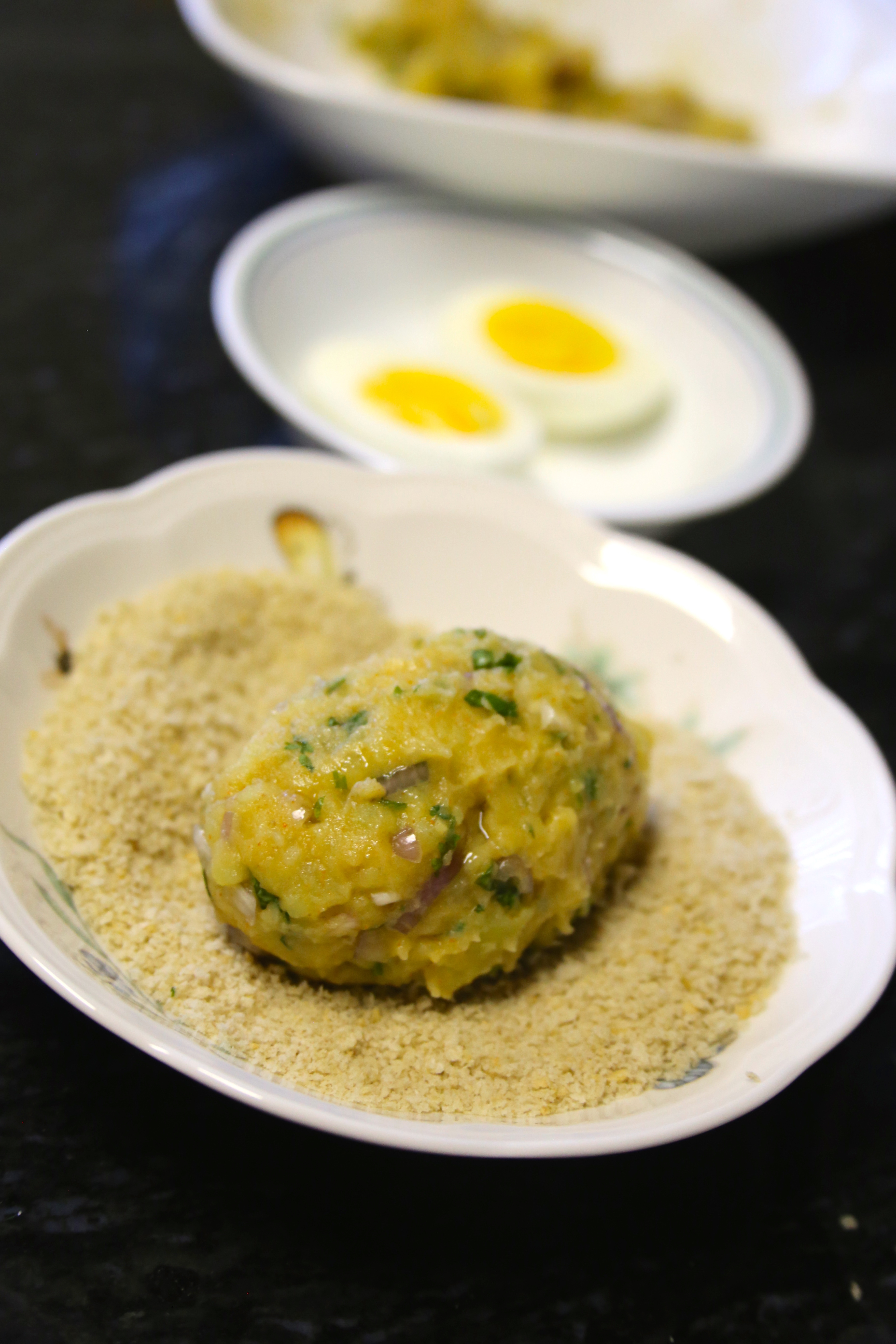 - Take a portion of the potato mixture, flatten it and place one of the half egg in the center.