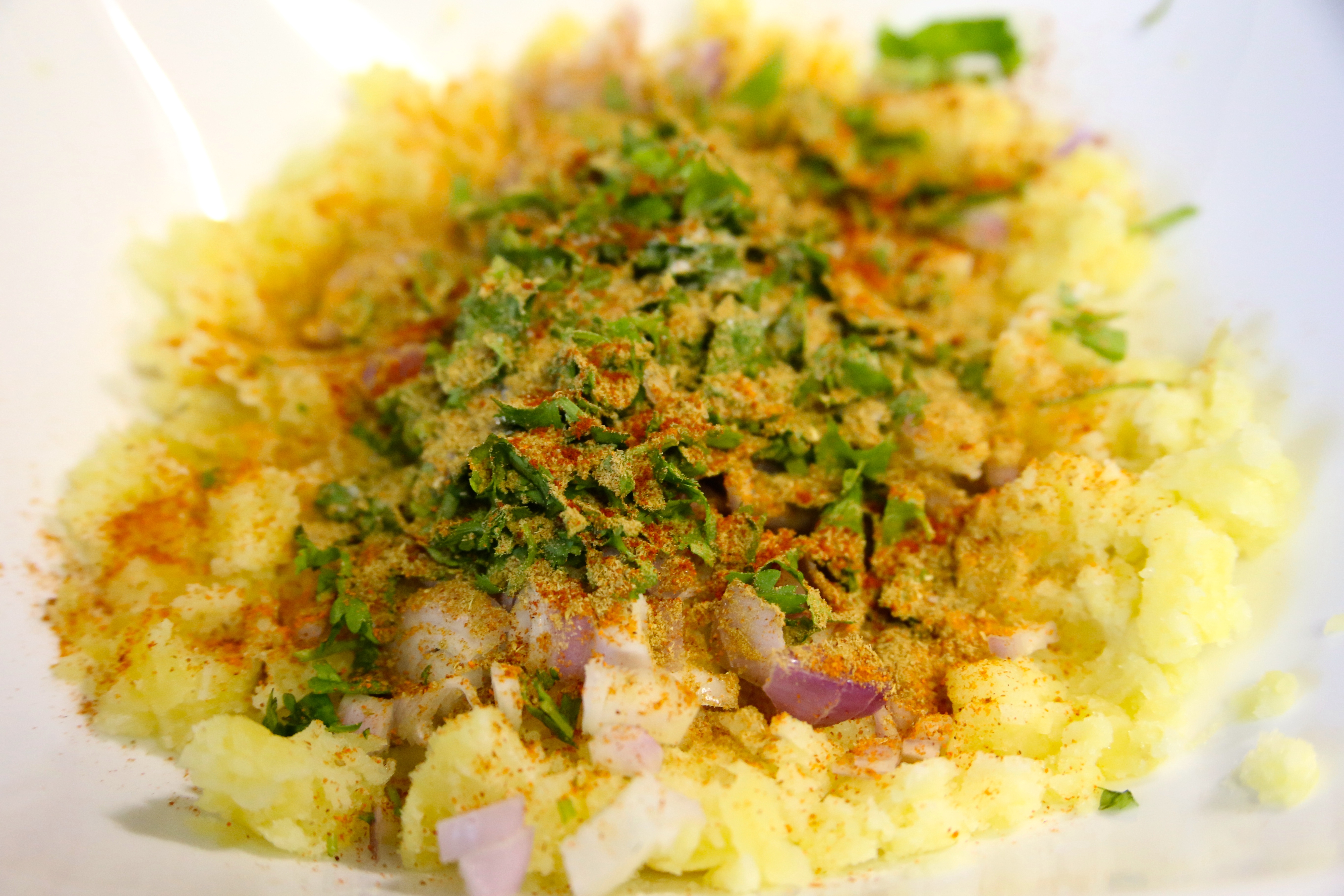 - Add the spices, chopped onions, cilantro and green chili pepper. Mix well